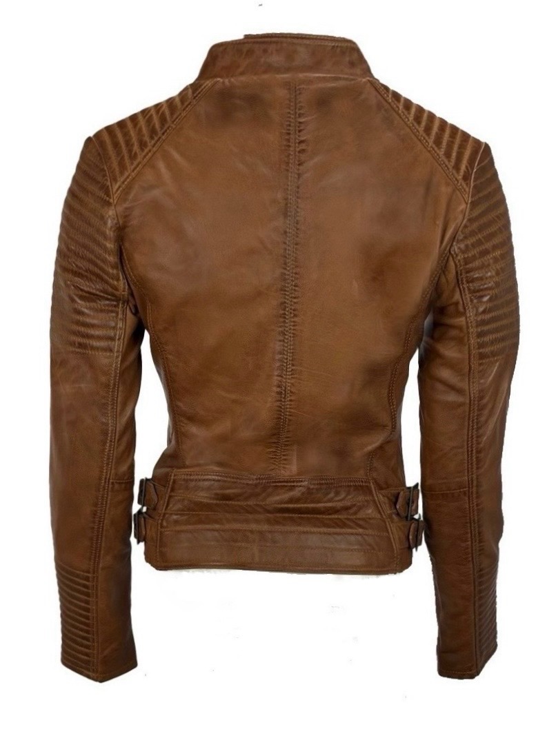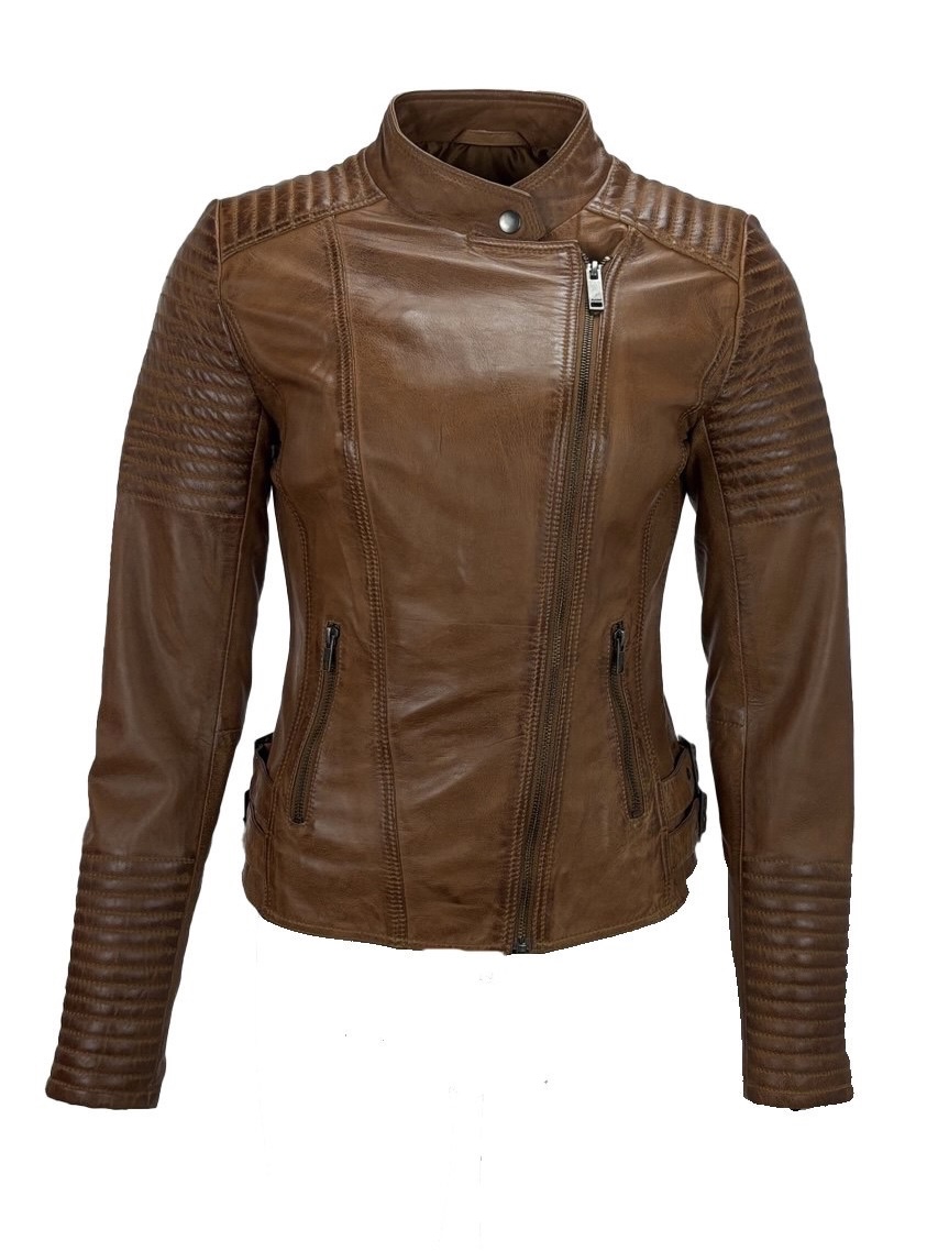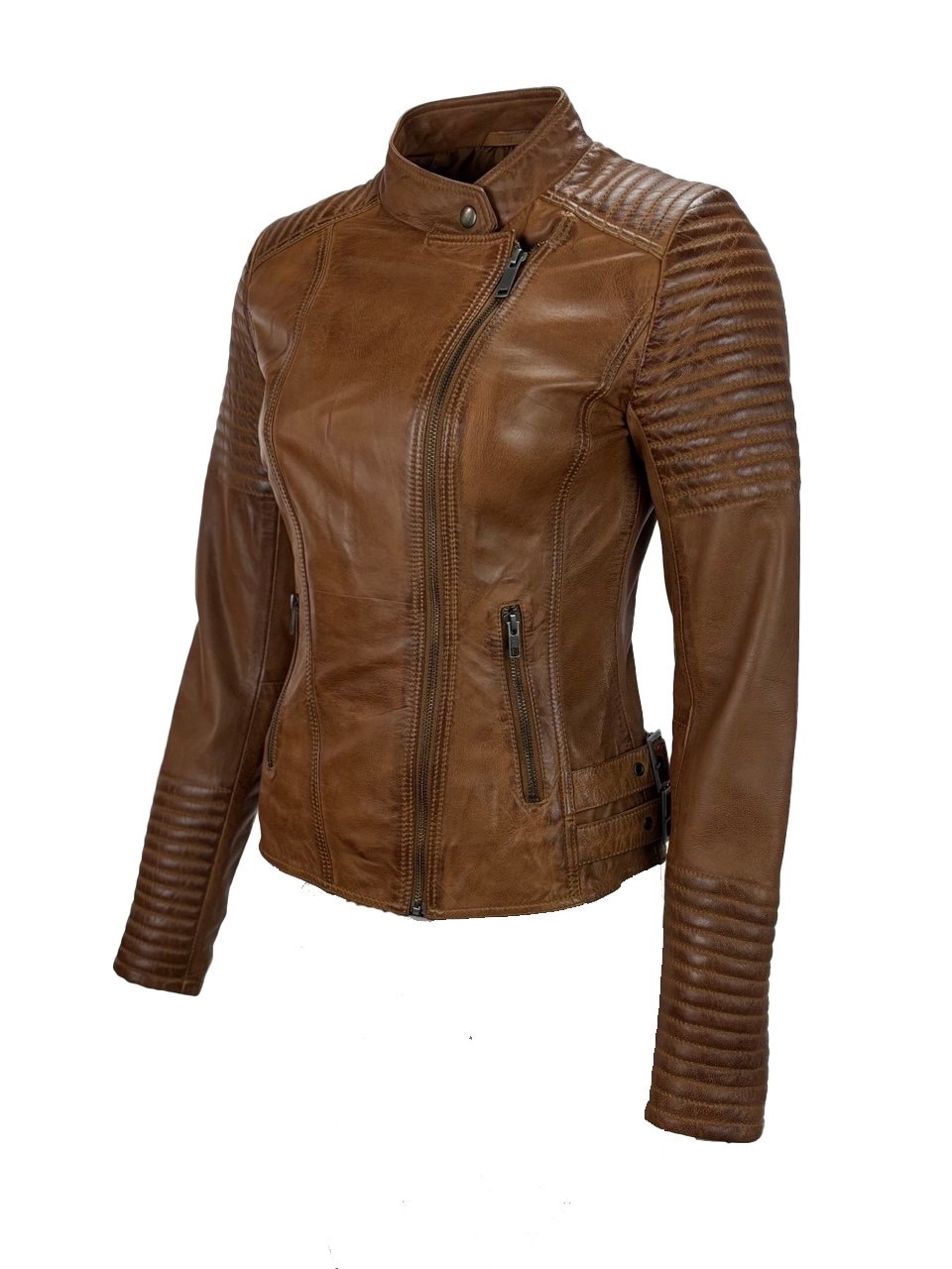 Ben je opzoek naar korte Cognac bikerjack voor dames?
